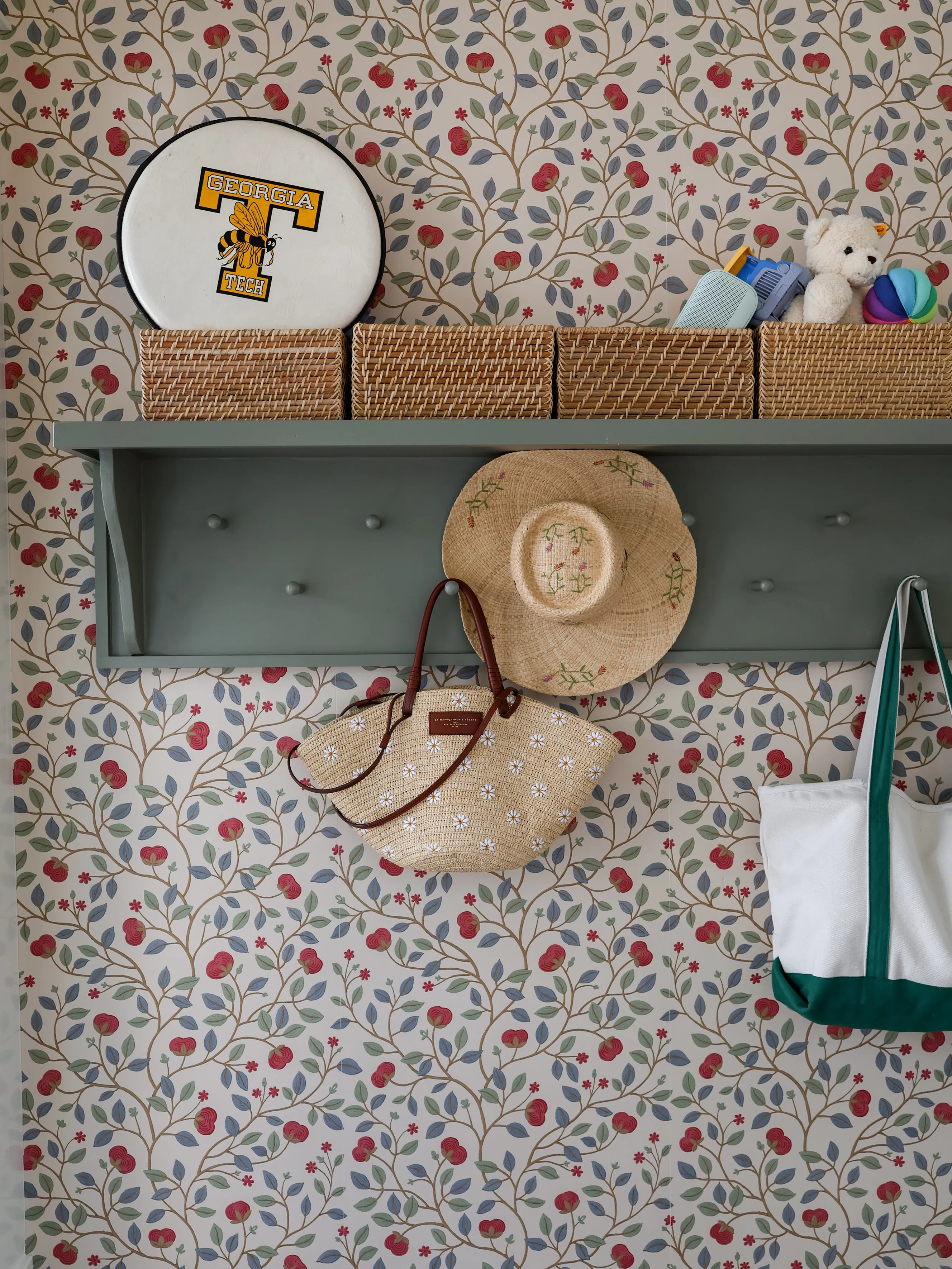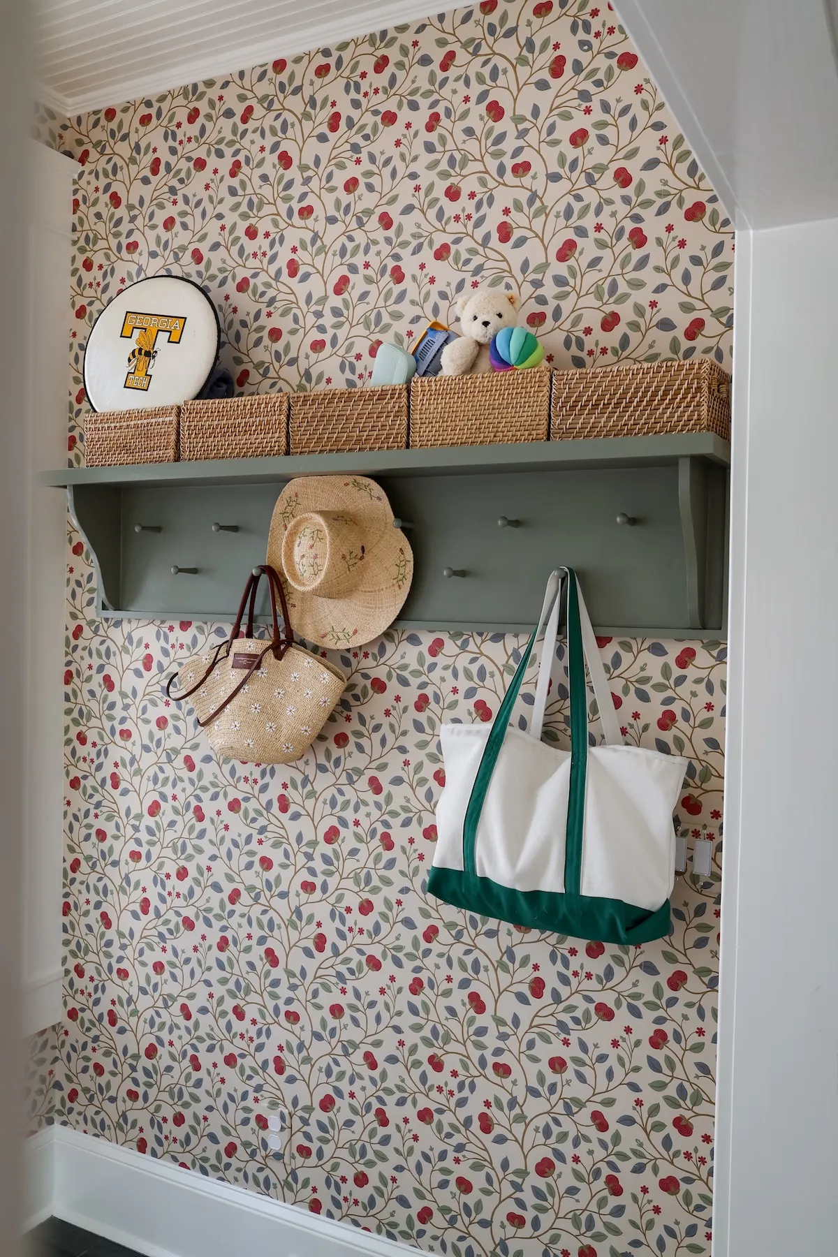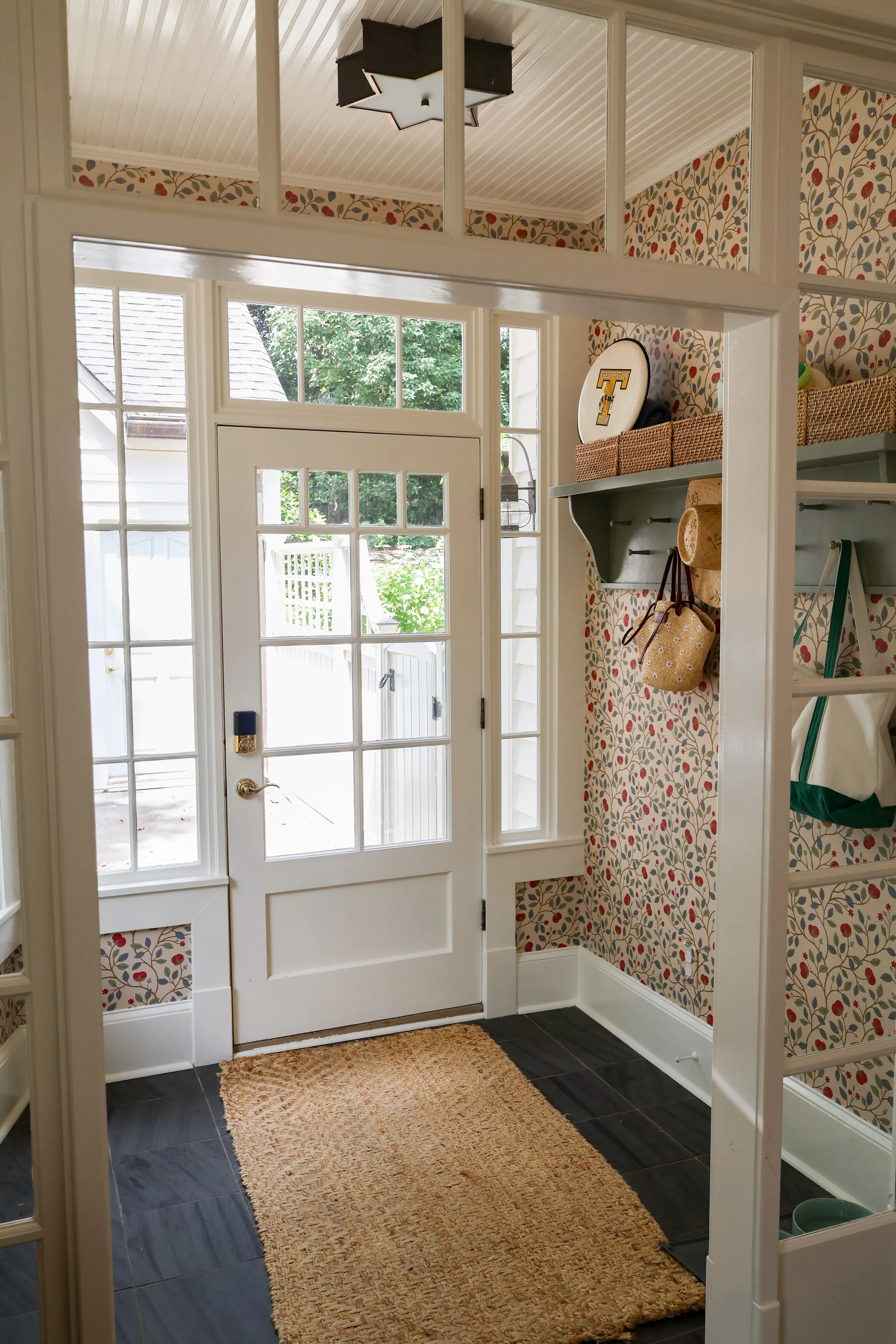 Wondering about the wallpaper? Instagram sold me on its cheerful colors, and yes—it’s gorgeous in person. But this paper is a diva. In a high-traffic spot like our mudroom, it shrank as it dried, leaving thin seams between every panel. Eye-catching? Absolutely. Easy to hang or keep pristine? Not a chance. Would I choose it again? Probably not, though I did over-order, so at least I have spare panels for the inevitable touch-ups.