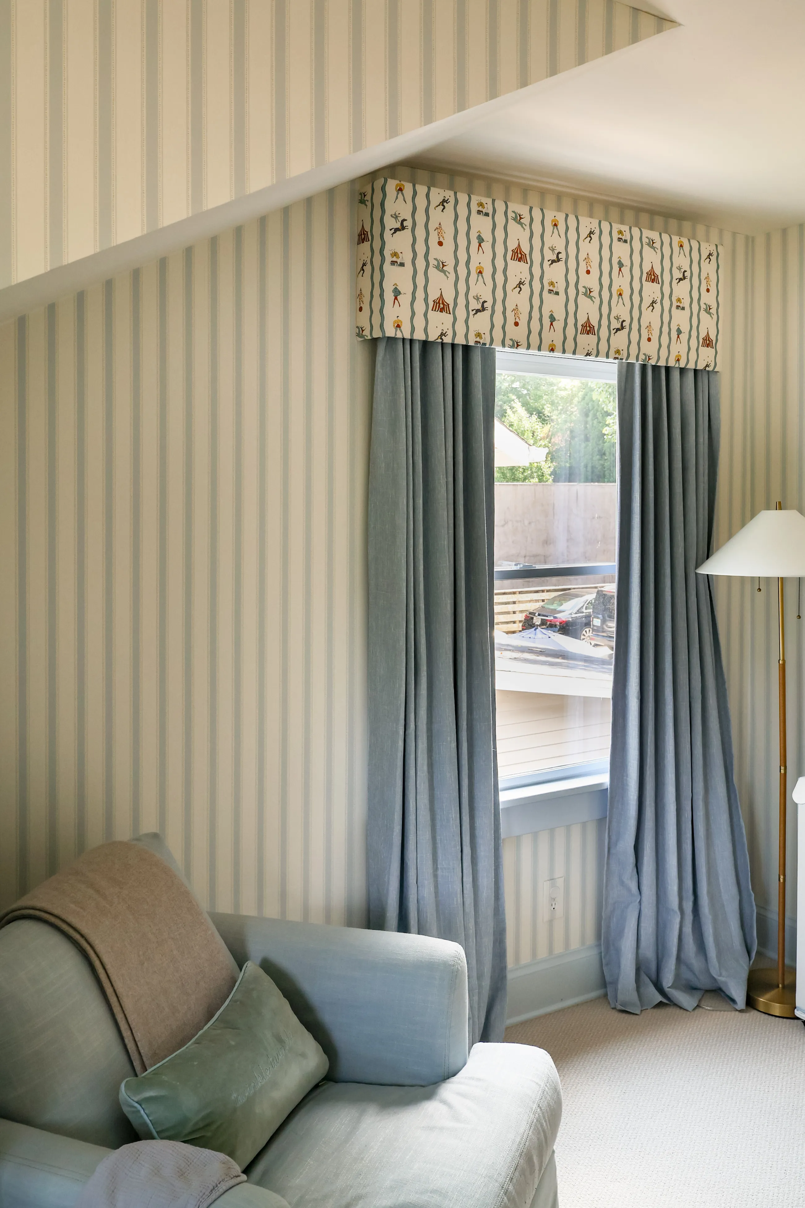 For the crib window, we had no flexibility, so I used a flat board that spans the full sash and kept it 9" tall to preserve light and clear the operable window—no formulas, just what felt right. For the chair window, the cornice extends 4" beyond each side, and the left edge runs straight into the vaulted ceiling angle, so we sized it to fit the space. In general, go taller when you can: cornice boxes add vertical lift to low windows and make treatments read wider.