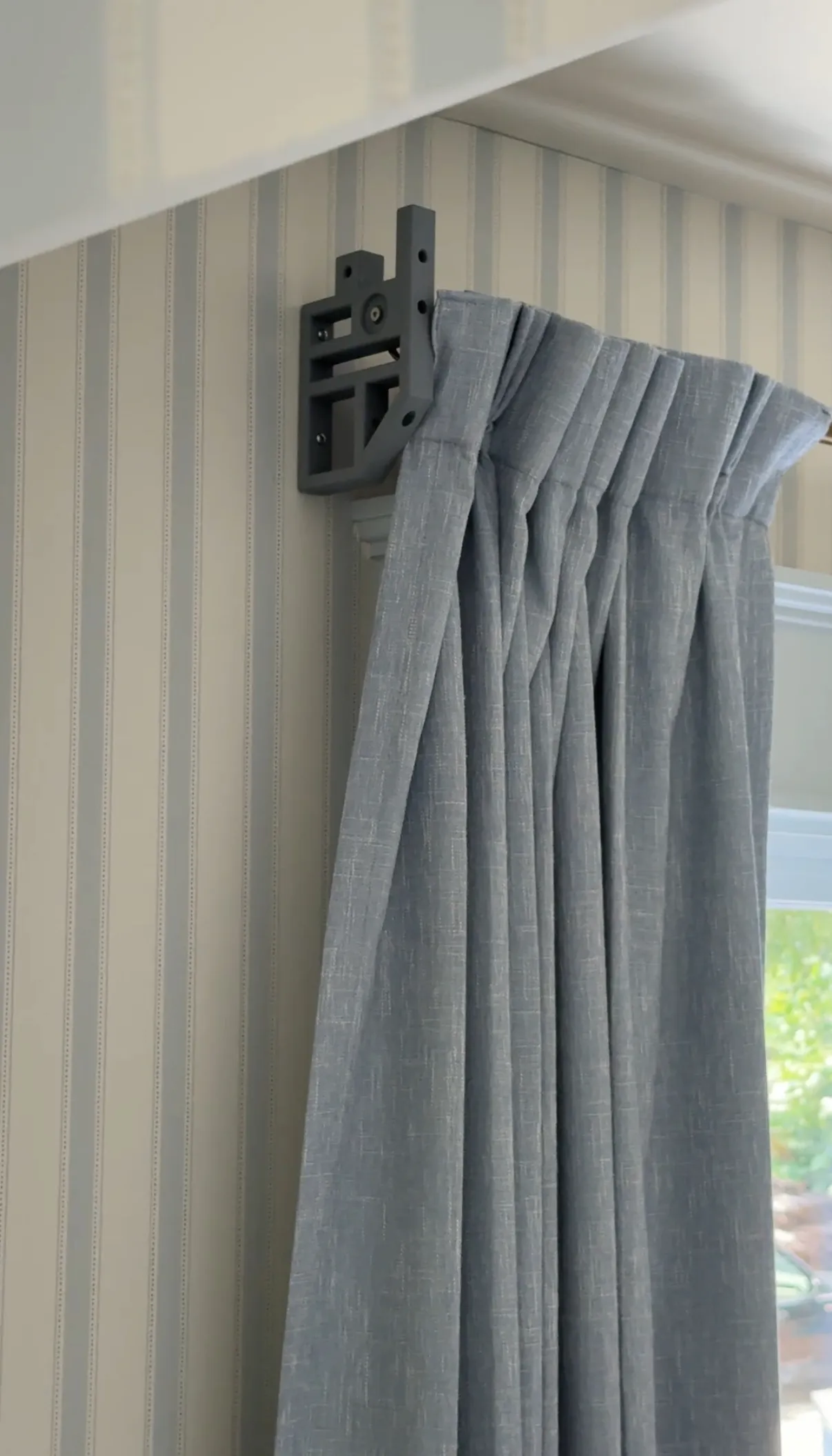Then came the cornice boxes. I planned a simple weekend project, but one “oops” later, the curtain rods we had already installed impeded us hanging the cornice boxes easily… Enter my husband who loves to over engineer everything. He designed and 3-D-printed custom mounts that not only fit the rod but also spared our drywall from extra holes. If you’re tackling a similar project, you can find our 3-d prints schematics here. Disclaimer, I have no idea where to get these printed if you do not have a 3-d printer.