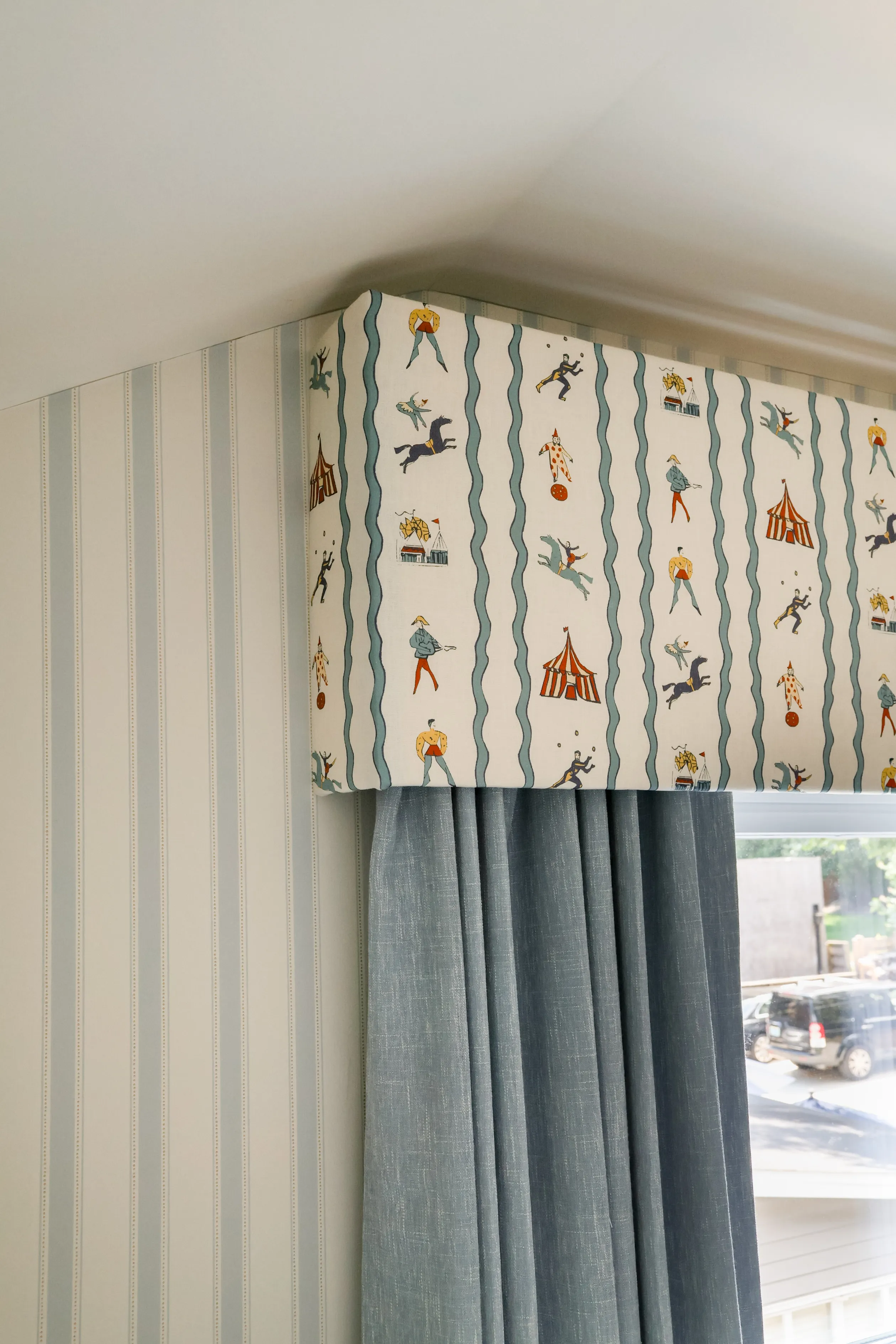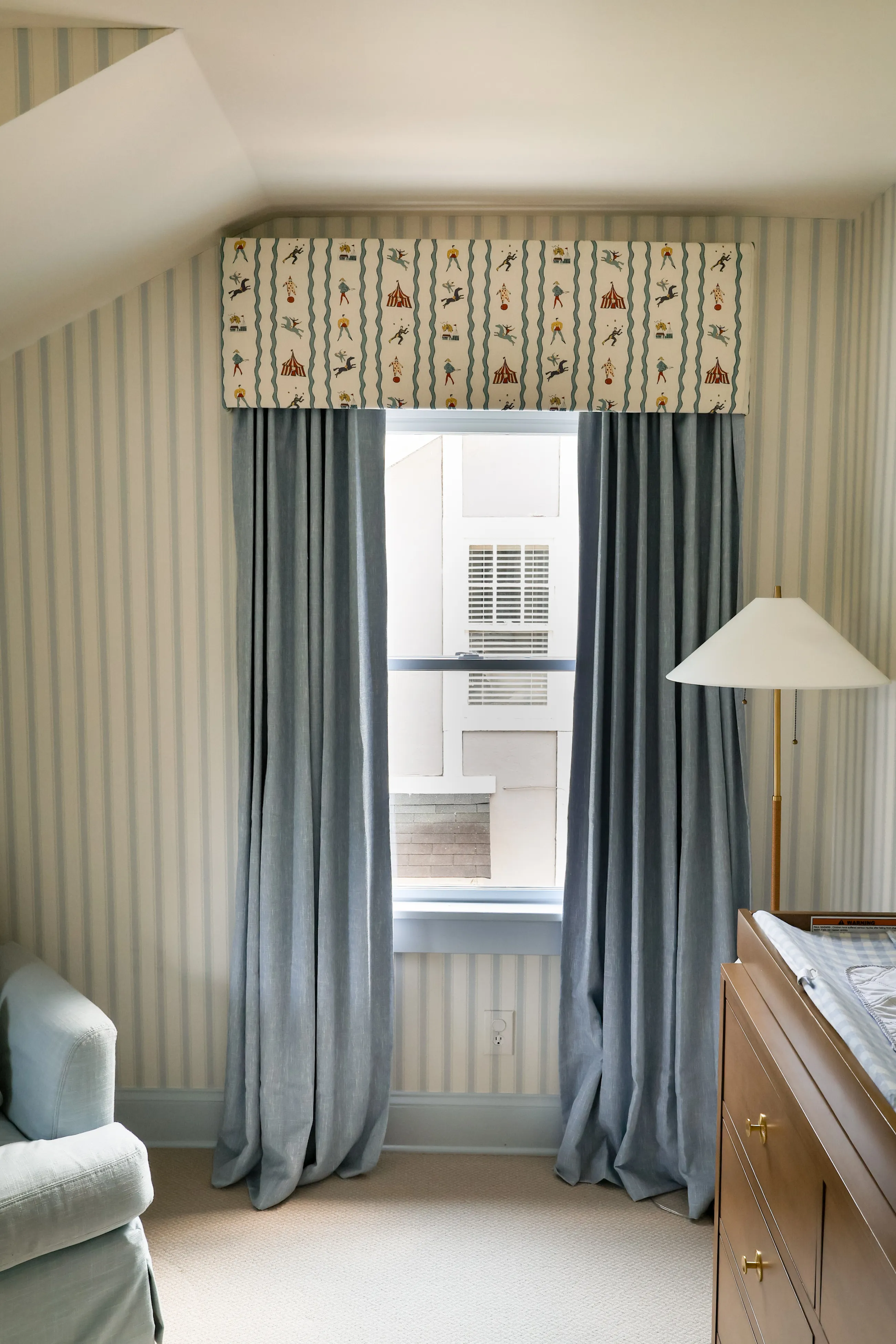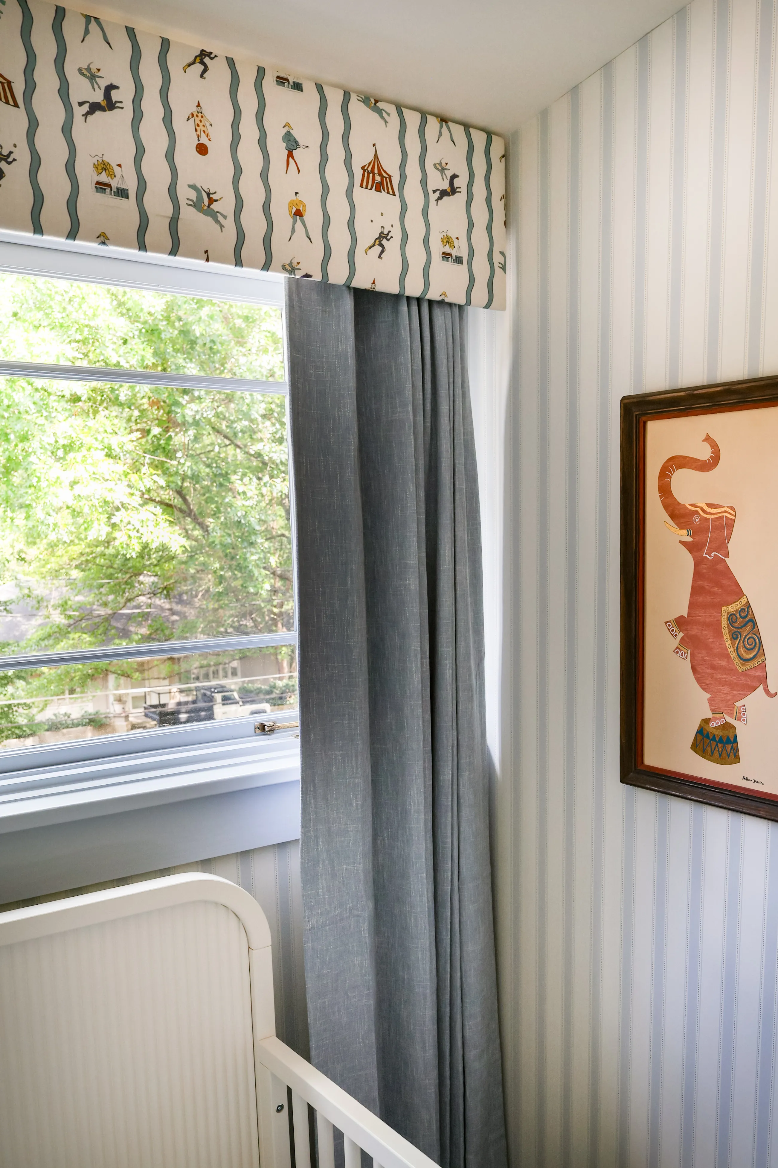 Before he was born, I found a fabric from Annika Reed Studio that stopped me in my tracks. Its vintage-circus vibe swapped the loud reds and yellows for a soft, dusty blue—exactly the mood I wanted. I’d already picked a blue-and-white striped wallpaper, and the fabric’s ric-rac stripe felt like the perfect counterpoint to those straight lines. My hunch was right: the two patterns play together beautifully.