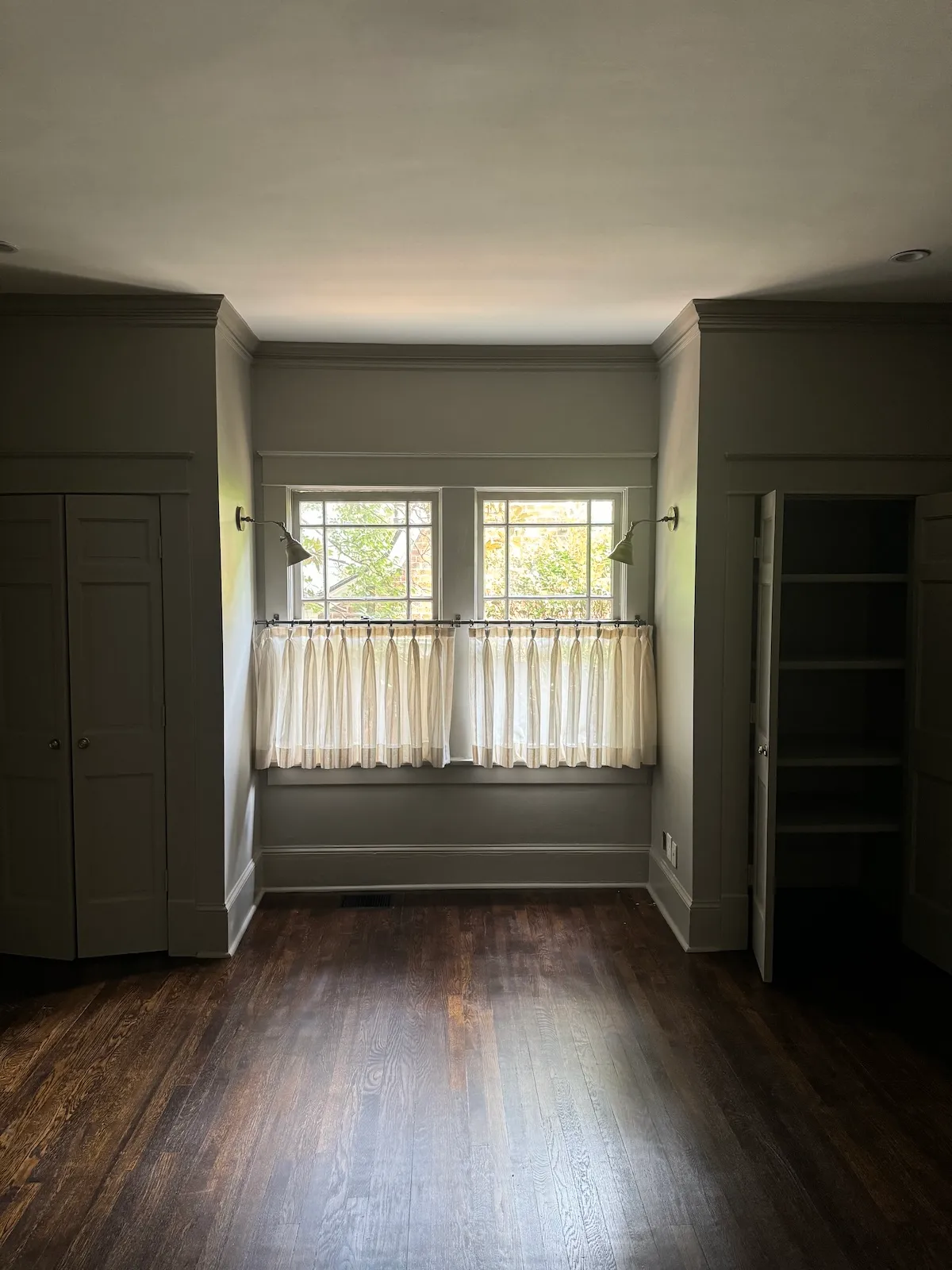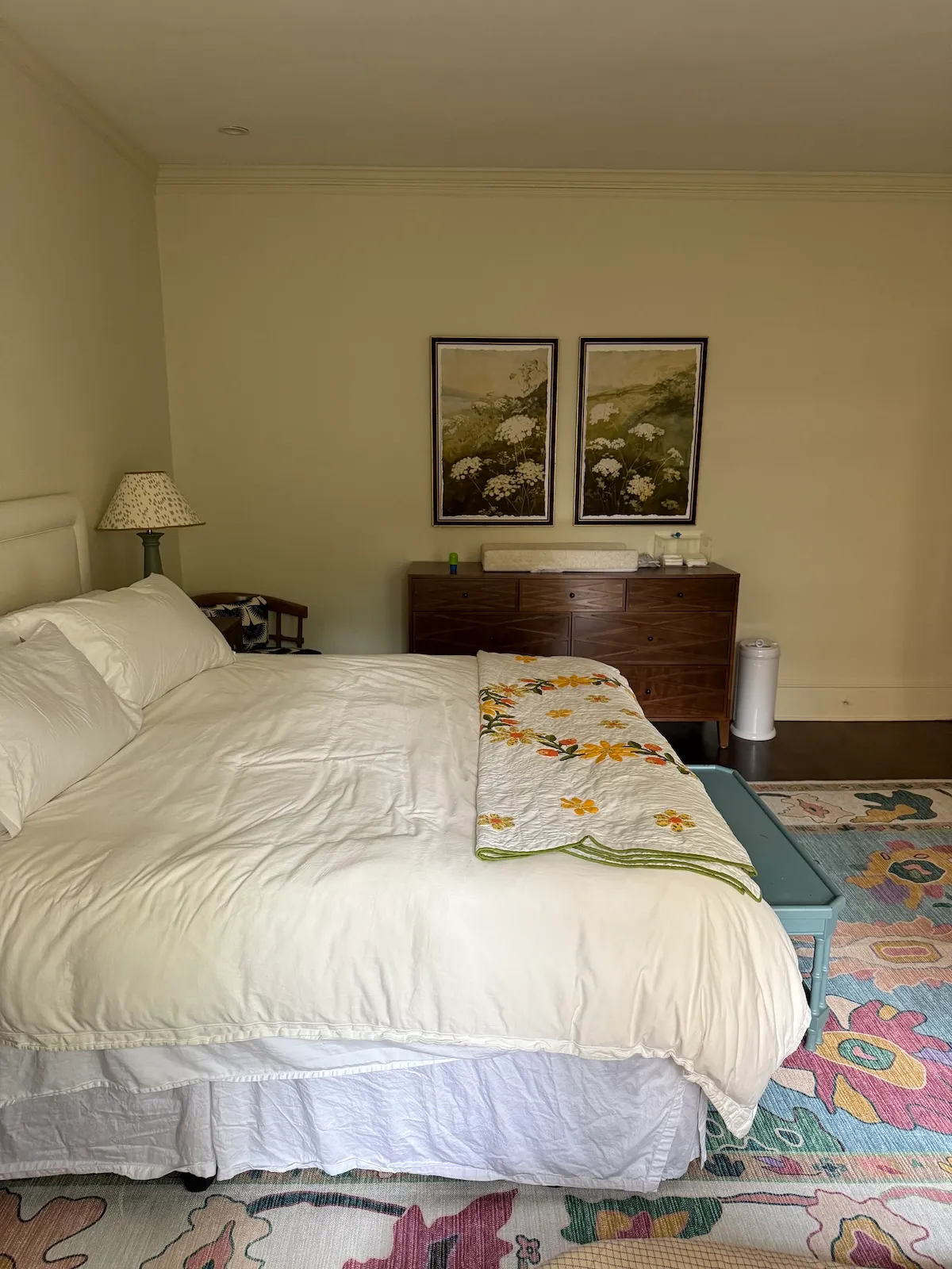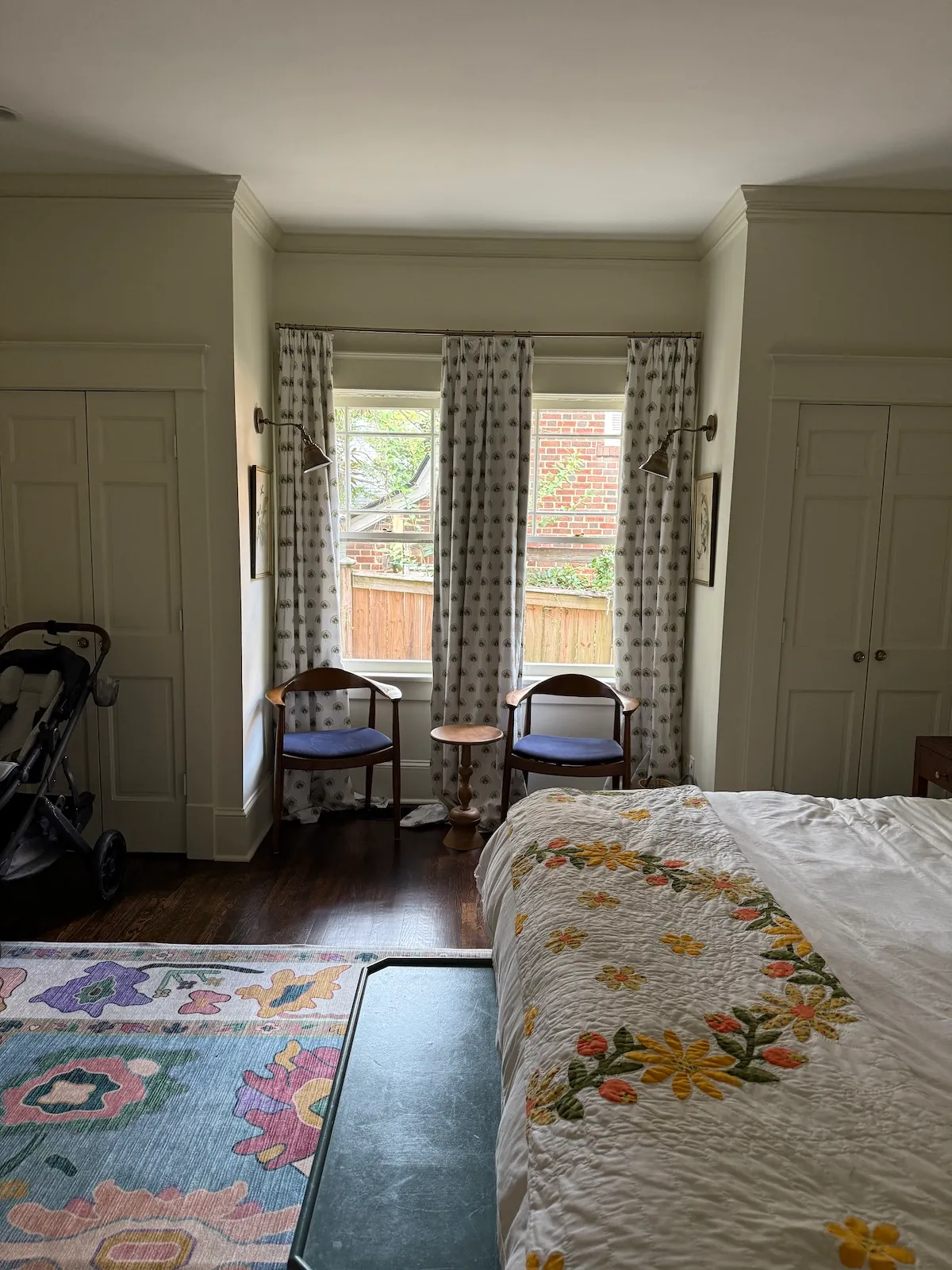 For furniture, it’s been a collection of leftovers: the nursery’s old standing dresser, a dresser we swore we’d ditch after moving, some blue-velvet Kennedy chair replicas that never quite fit, curtains puddling awkwardly on the floor, and a rug I refuse to even discuss. In other words: it’s overdue for a personality of its own.