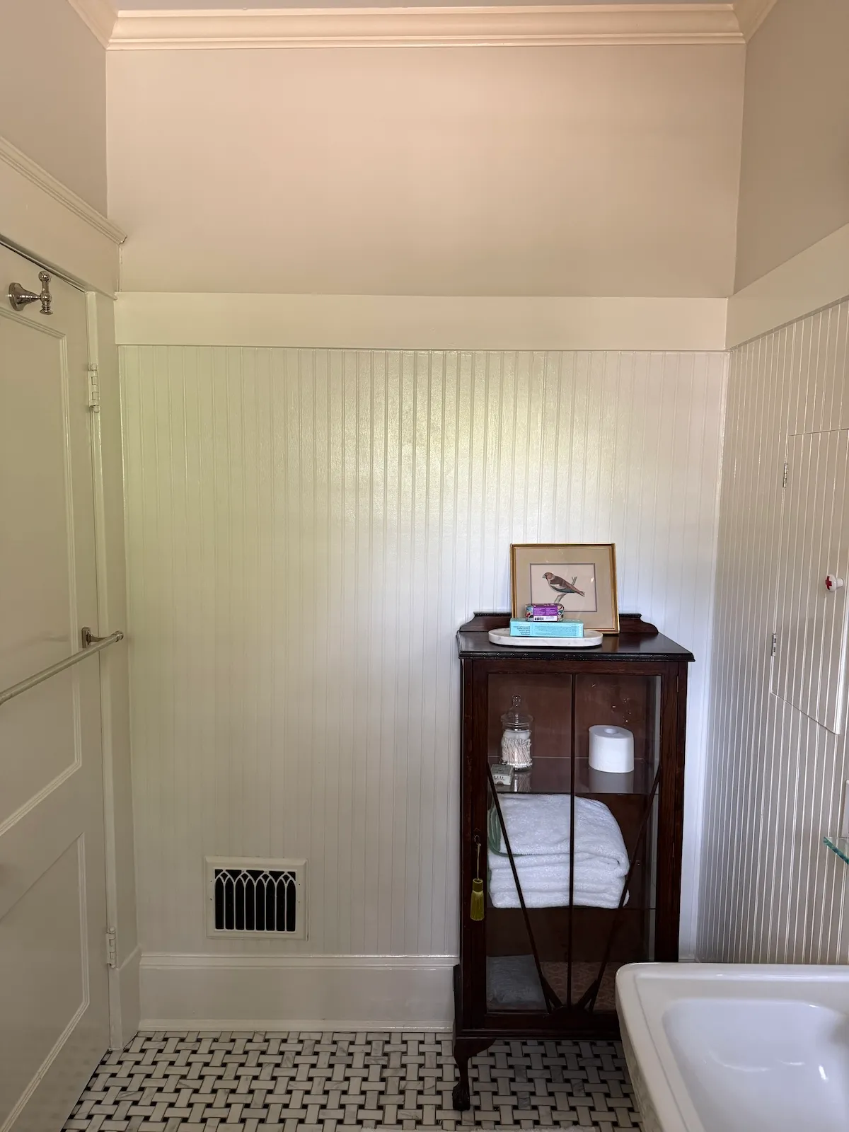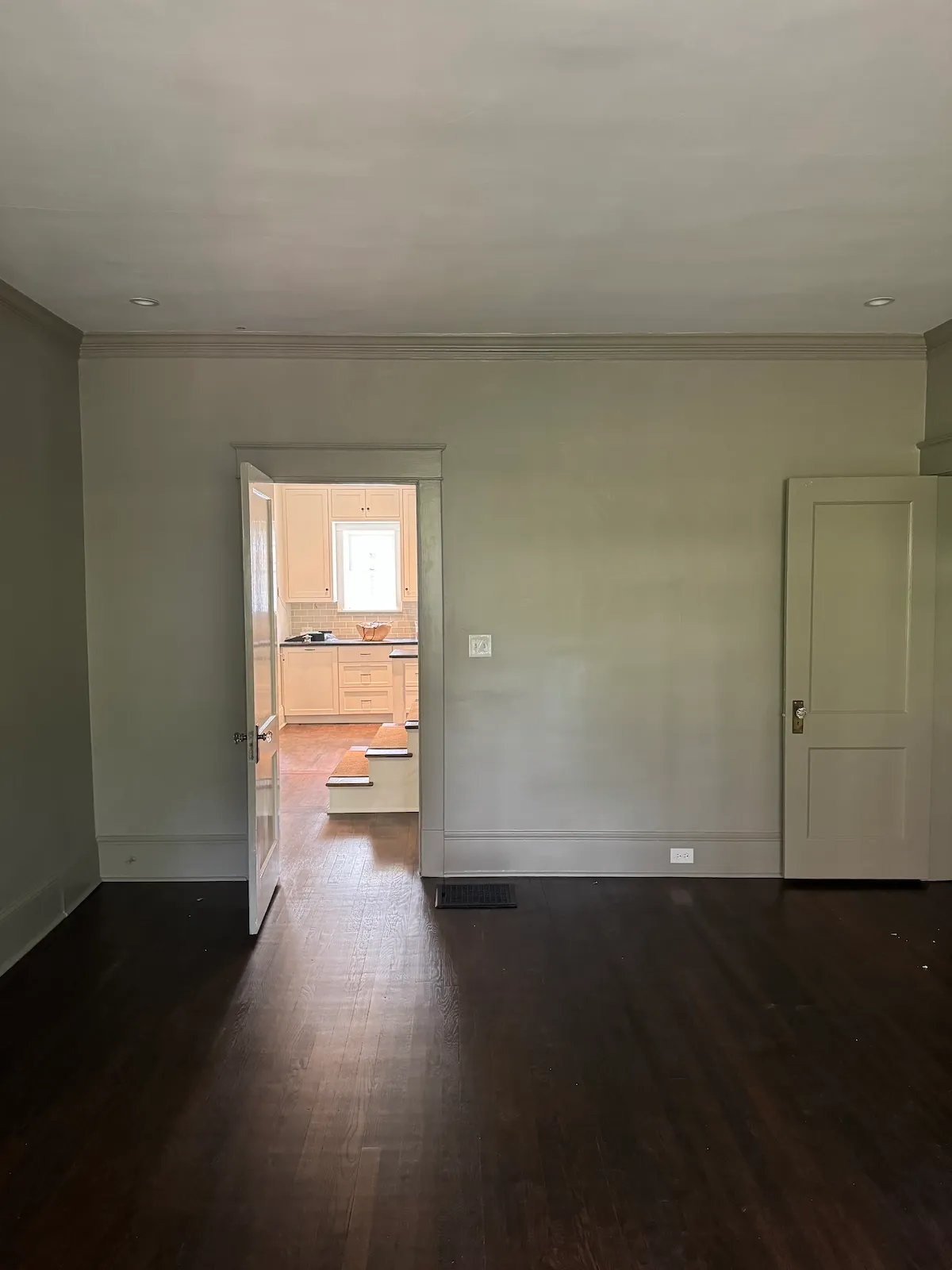 The room was painted a dark green, which made it feel even smaller and gloomier—especially since it only has one window that doesn’t get direct light. To brighten things, I had it repainted in Benjamin Moore’s Celery Salt, a pale green-yellow that feels fresh and underrated.