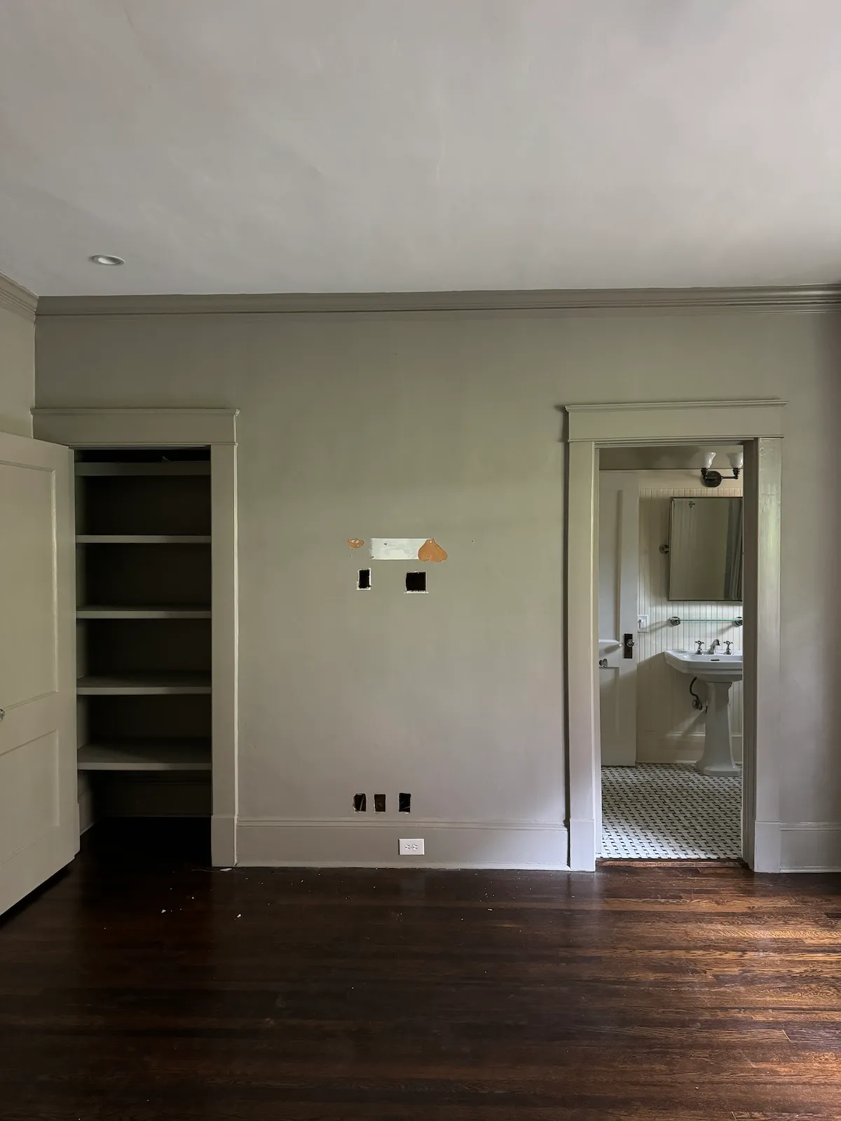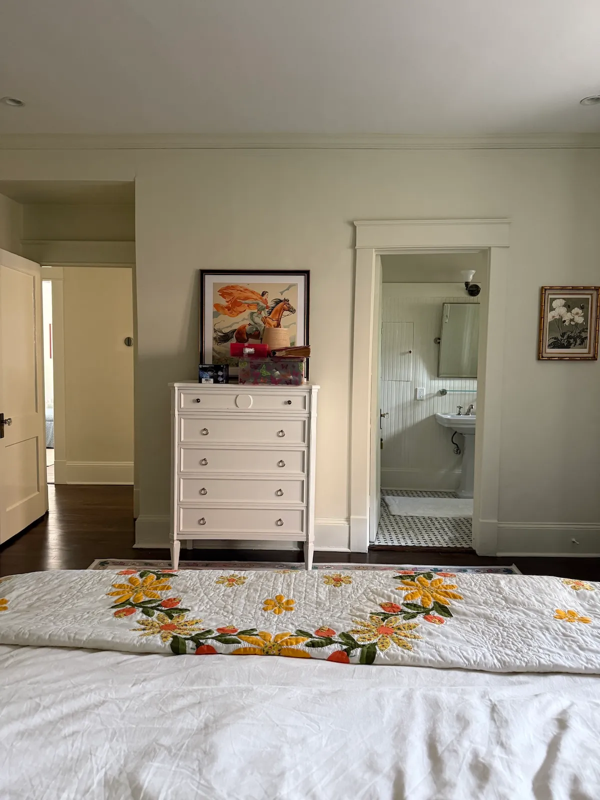Originally, the guest room’s doorway opened straight into the kitchen—not exactly private. To make it feel more like a suite, we moved the entrance to the back hallway, closed off a duplicate door to the bath, and sacrificed one closet in the process (which is now how you enter the room).