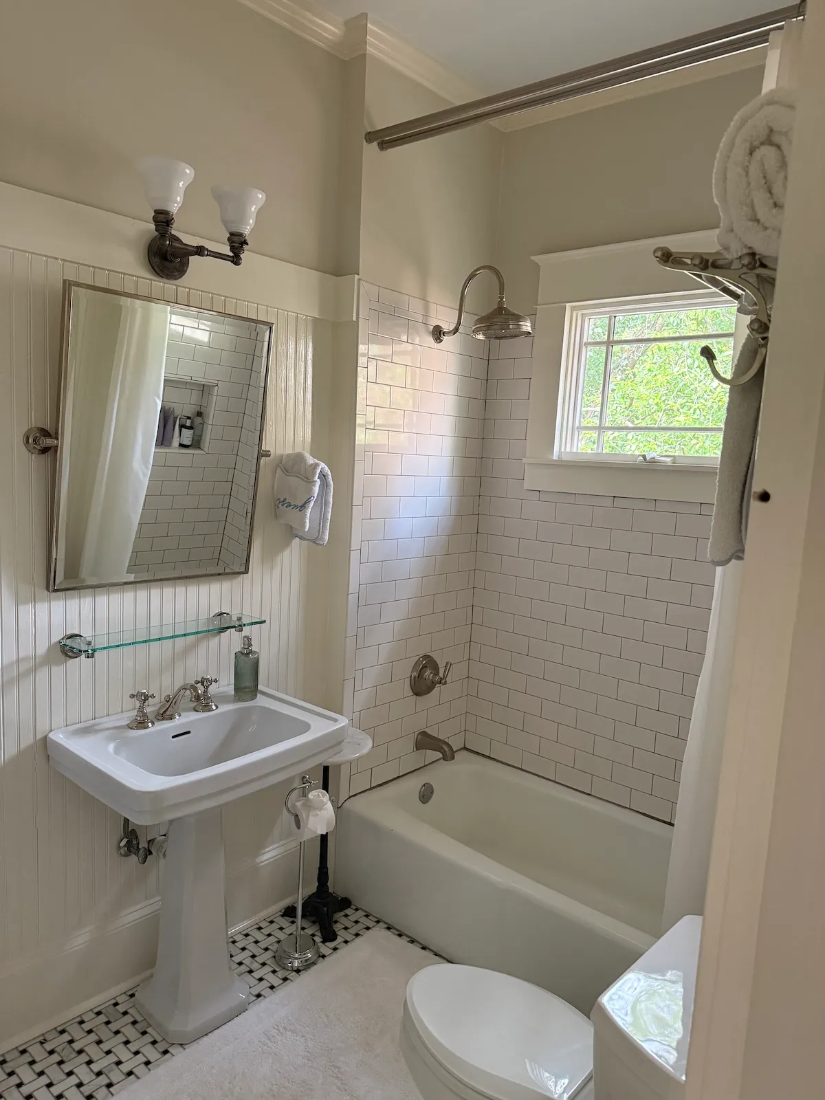 So why do I call this project unhinged? My friend Kenan once transformed her mudroom by turning a book of lithographs into wallpaper. I knew instantly I’d try the same if the opportunity ever came along. With Marianne North as my guiding “North star” (pun intended), it felt perfect for our guest suite: a dramatic lithograph wallpaper entryway leading into the bedroom, with the en suite bath getting its own bold treatment.