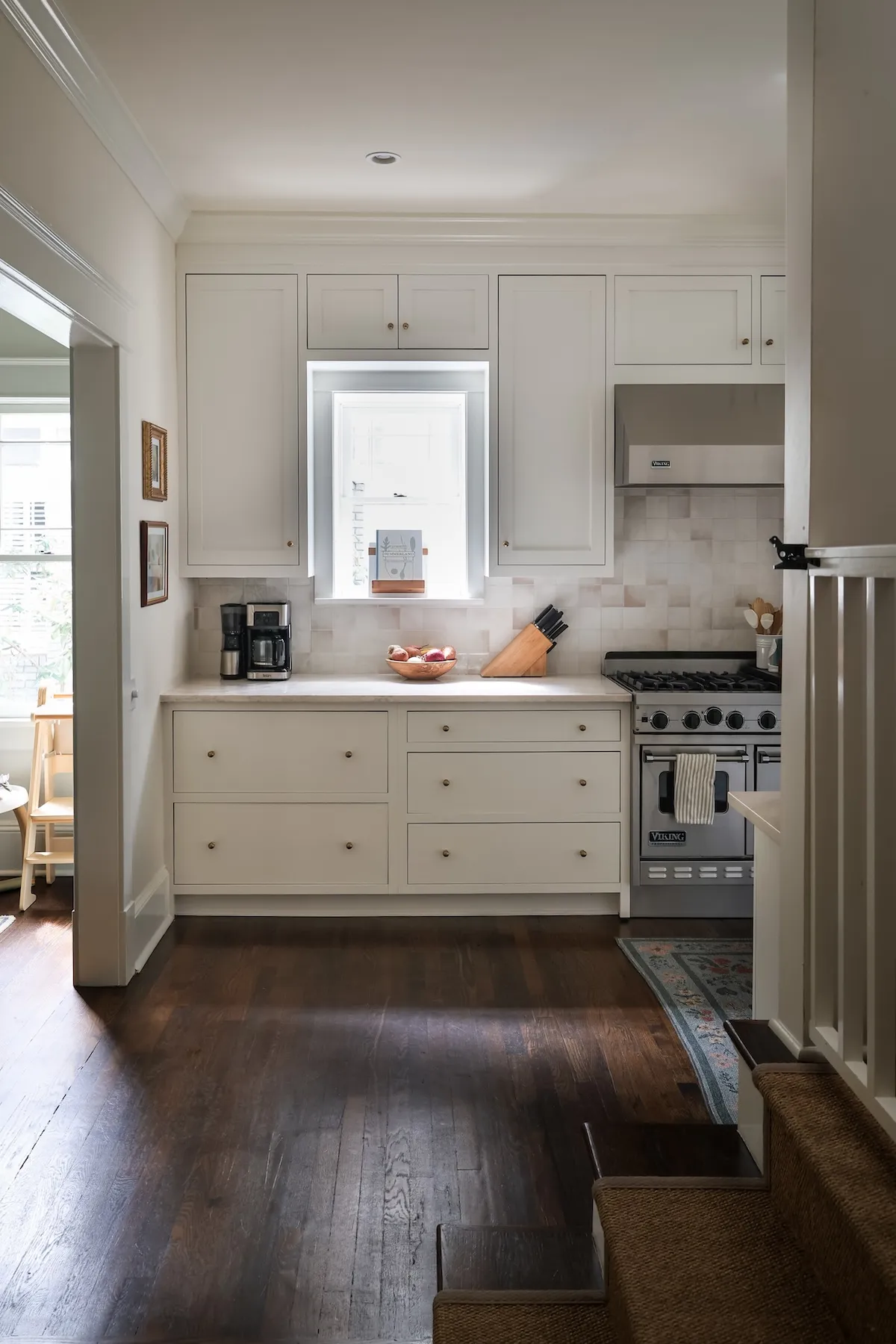 In the end, I’m glad I didn’t go dramatic with color. In a small pass-through kitchen like ours, too much darkness would have closed it in. The white makes it airy, bright, and timeless.