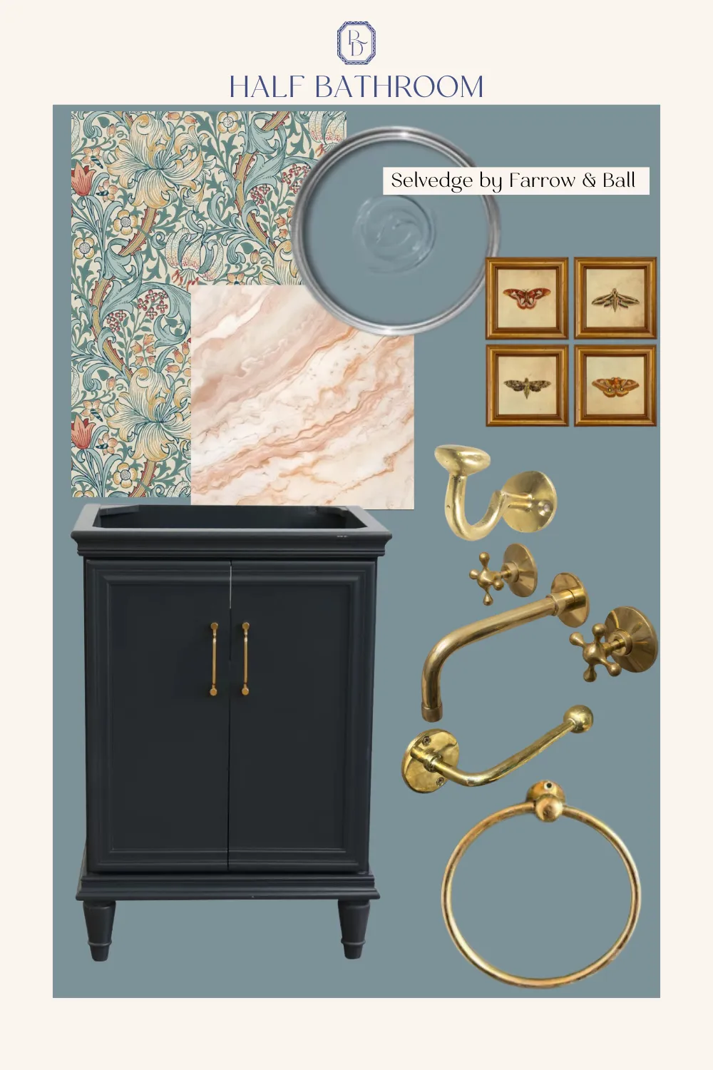 This bathroom is tiny. Custom cabinetry was quoted at $1,400 (yikes!), so I found a narrow, two-door sink base online that fits perfectly. We'll add a marble remnant countertop for a polished look. The sink base, a soft gray, pairs beautifully with "Inchyra Blue" by Farrow & Ball, which ties into the overall palette.