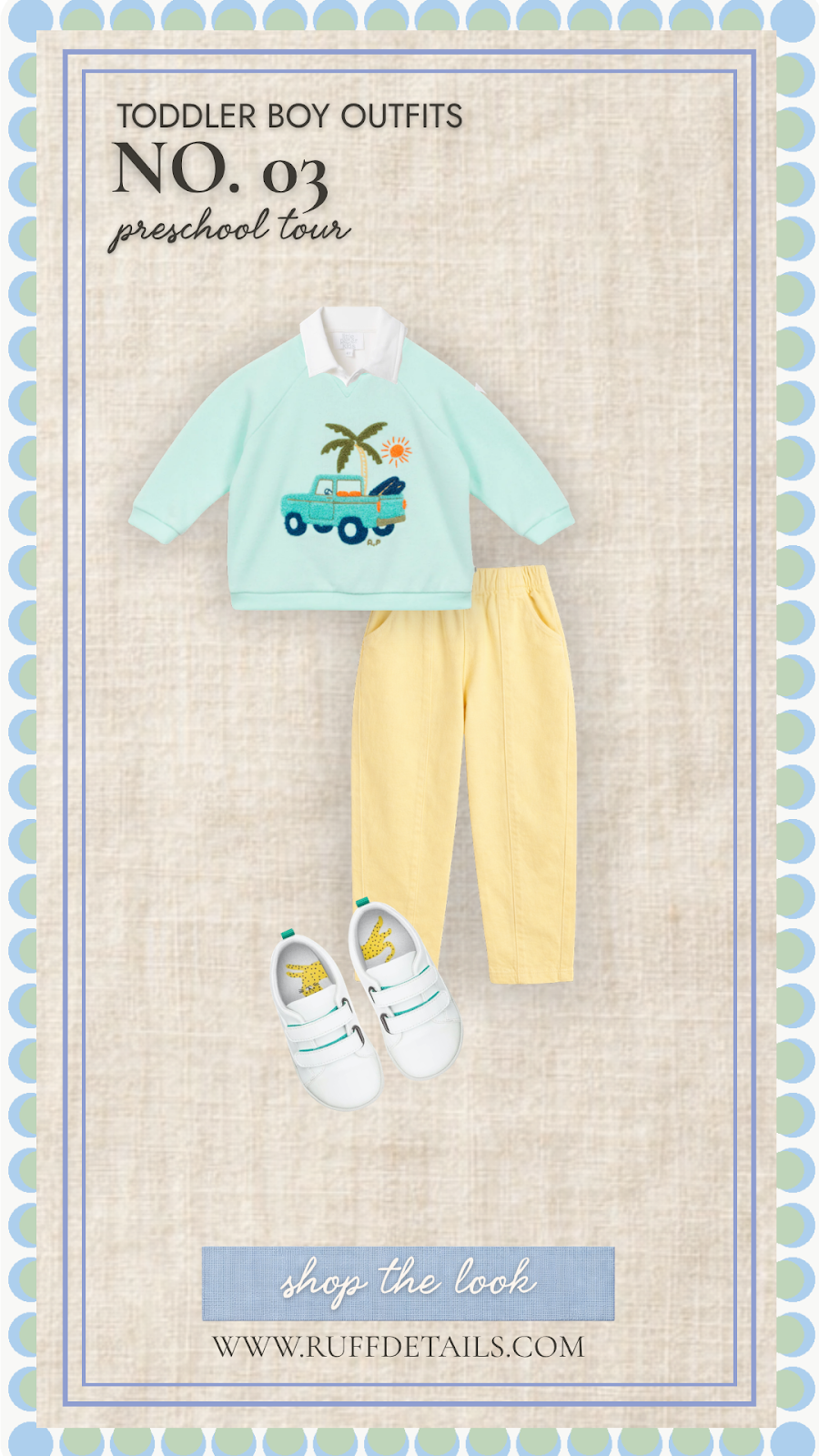 For preschool tour day or the first day of school, this spring toddler boy outfit strikes the perfect balance between polished and comfortable with a surf-themed embroidered sweatshirt layered over a collared shirt. Butter yellow pants and clean white velcro sneakers make this one look that photographs beautifully too.