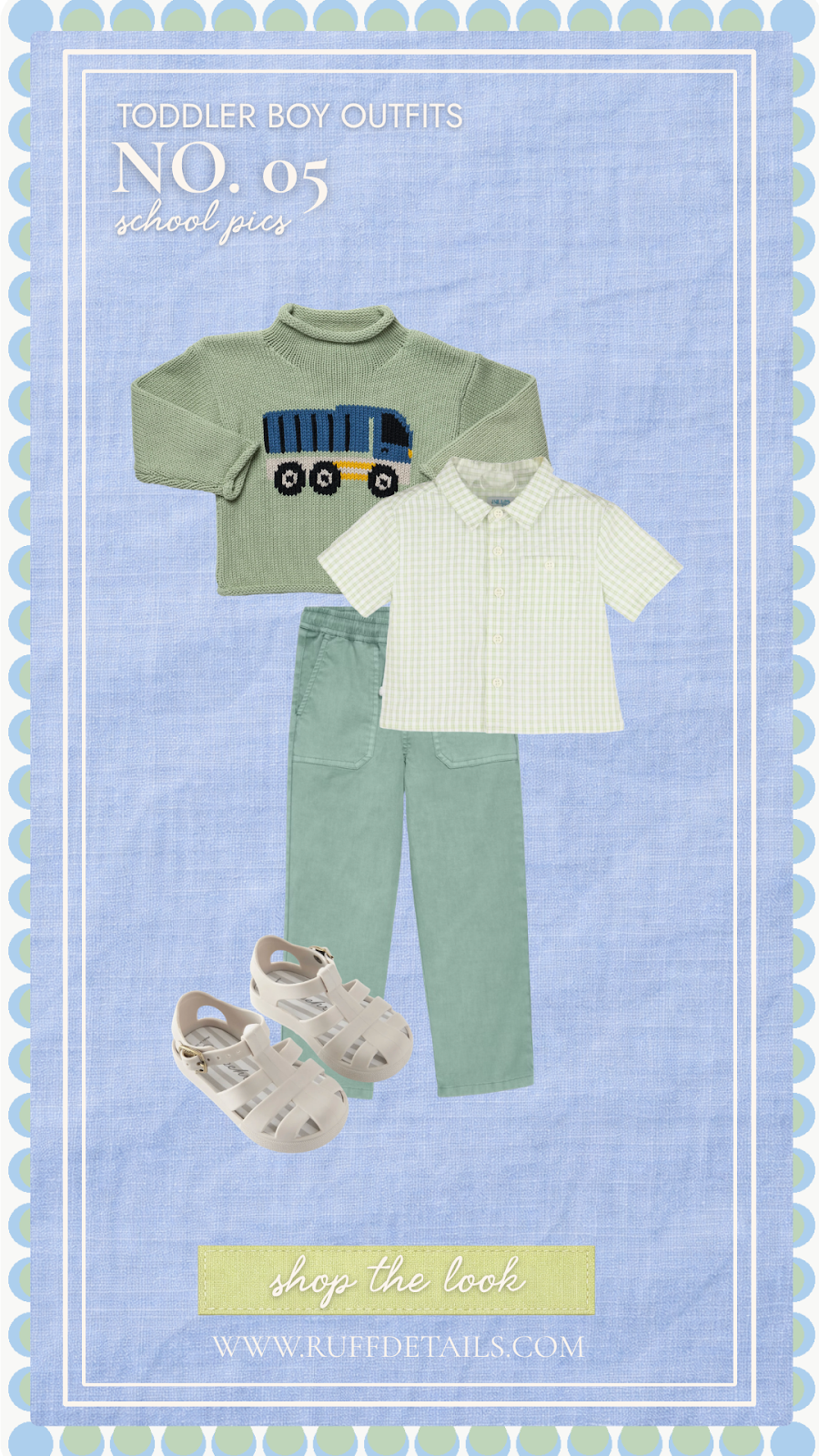 This is the spring toddler boy outfit for picture day, featuring a sage truck sweater layered over a soft gingham button-down for a look that is classic, sweet, and mom-approved. Sage twill pants (sale at $31) and cream jelly sandals complete a coordinated palette that will look stunning in every single photo.