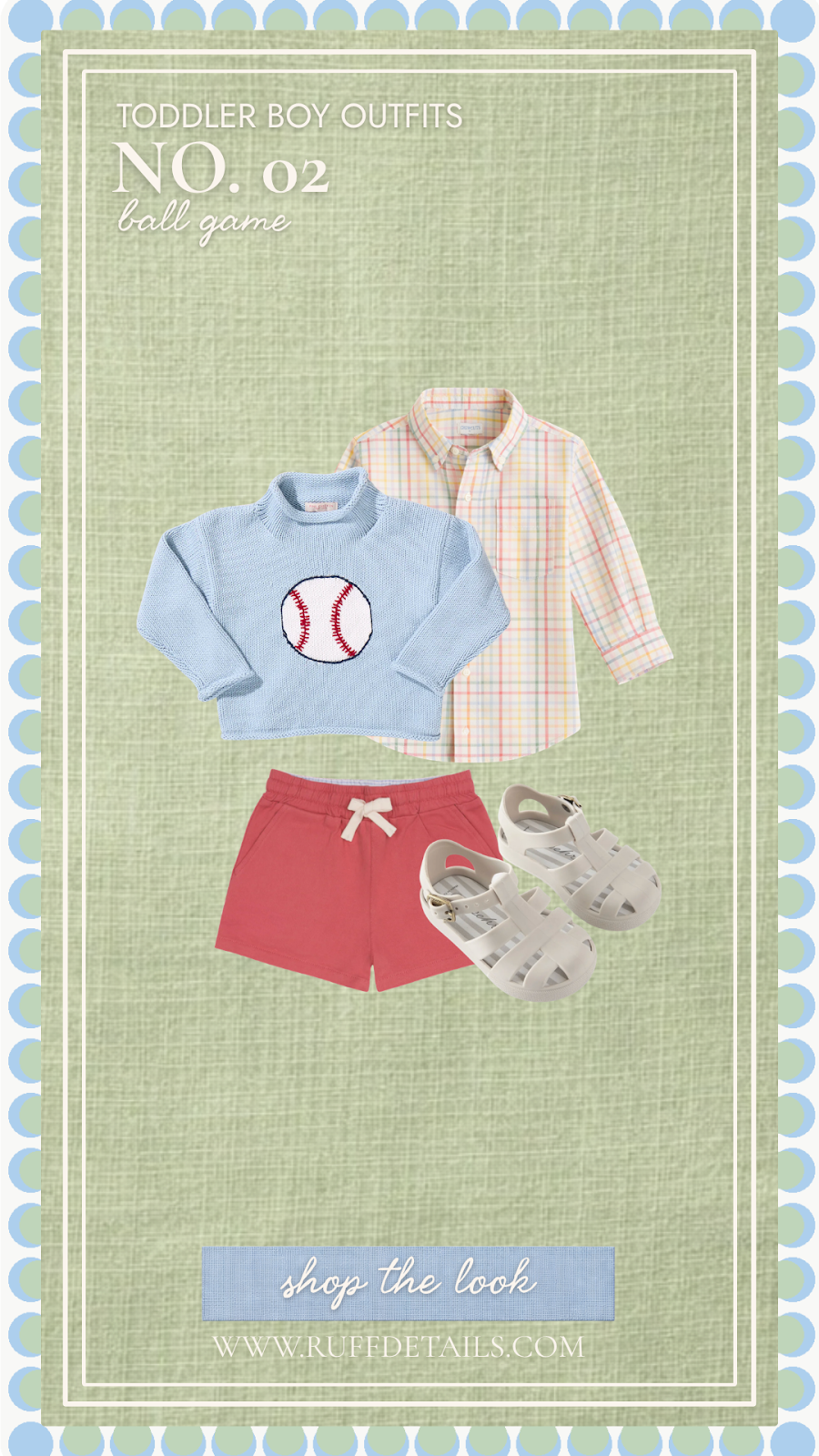 A light blue baseball sweater layered over a pastel plaid button-down makes this one of the most charming spring toddler boy outfits for cheering on your favorite team. Terra cotta shorts and jelly sandals round out the look with just the right amount of laid-back preppy.