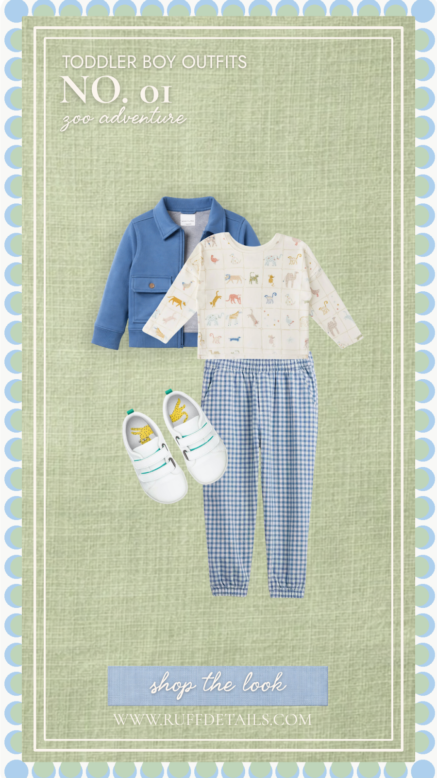 This sweet spring toddler boy outfit is built for a big day at the zoo, pairing a whimsical animal-print tee with a crisp blue jacket (on sale for $22) and gingham pants (on sale for $15) that are equal parts adorable and practical. White velcro sneakers keep little feet comfortable from the giraffes all the way to the gift shop.